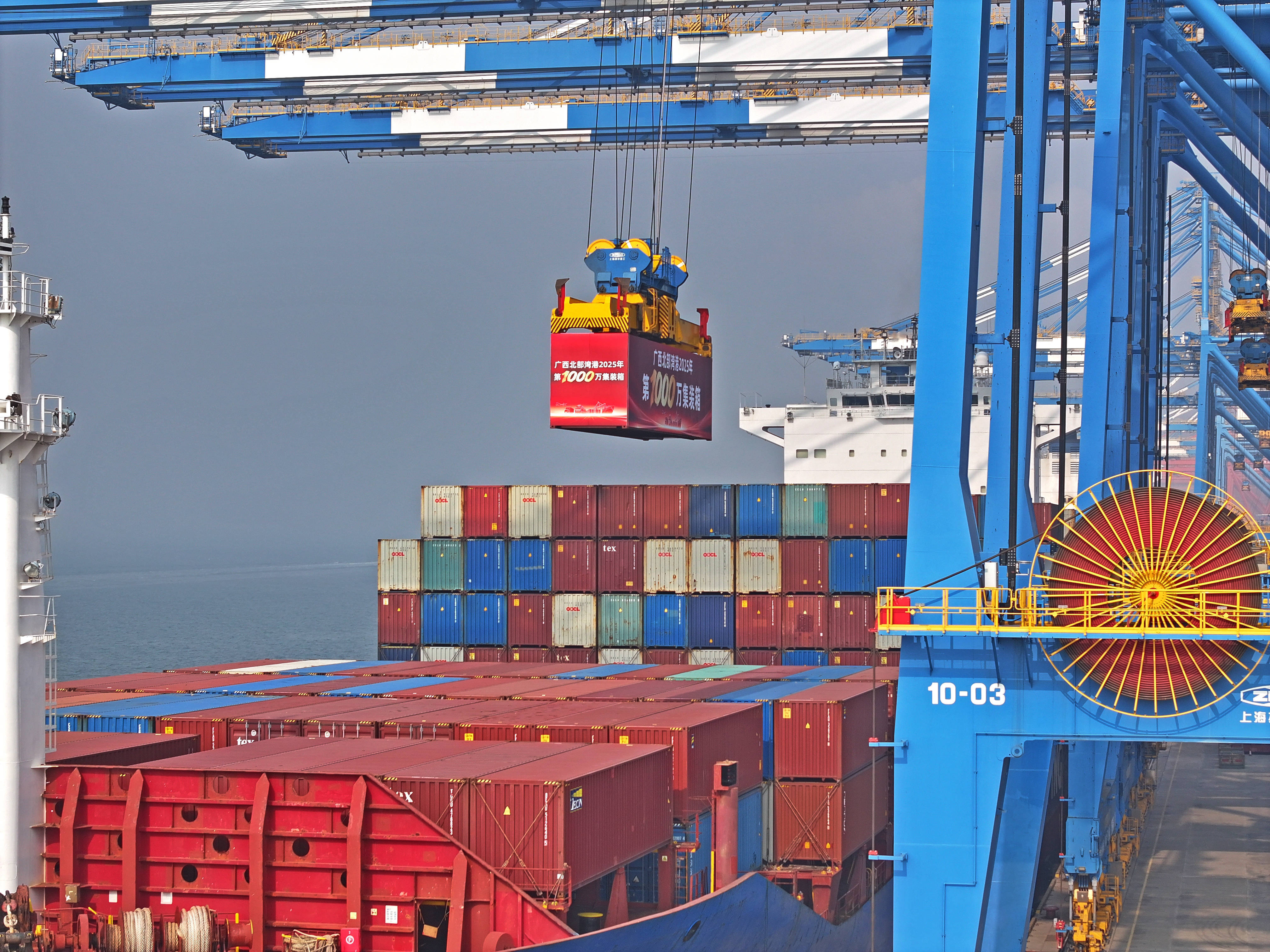 12月30日,广西北部湾港在进行第1000万个标箱吊装(无人机照片)。新华社记者 周华 摄“我们通过钦州港等北部湾港口开展运输,看到了中国西部市场的巨大潜力。”泰国驻南宁总领事馆总领事彬嘉玛·塔维她雅浓说,交通物流条件持续改善,为泰中及东盟国家深化经贸合作提供了良好基础。